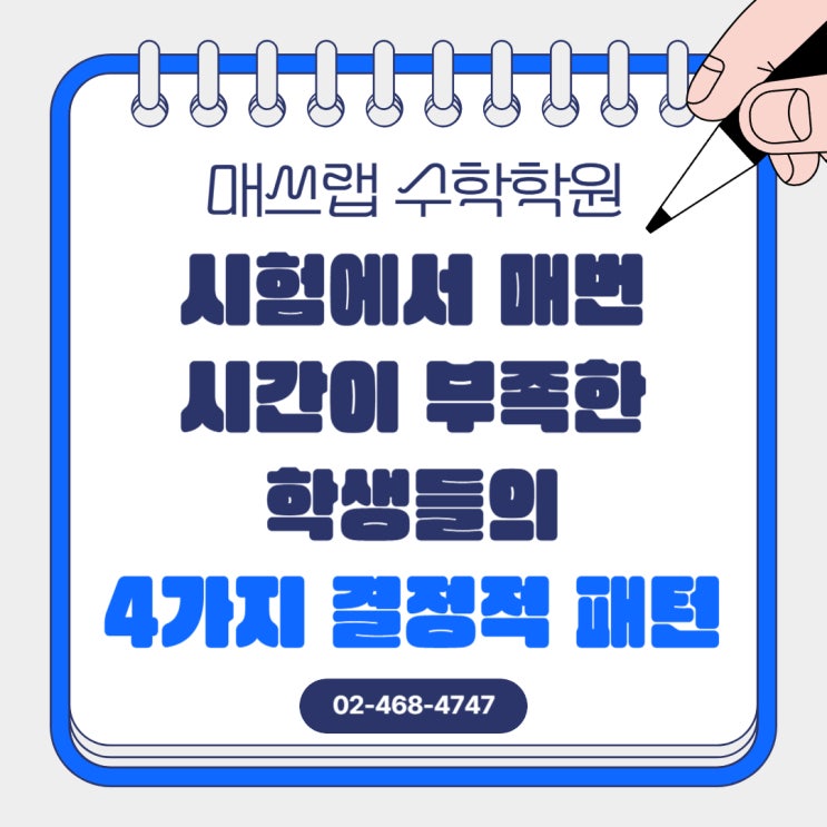 시험에서 매번 시간이 부족한 학생들의 4가지 결정적 패턴 안녕하세요. 매쓰랩 제일학원 수학언어연구소입니다. 수많은 학생의 시험지를 분석하고 실전 현장을 지켜보며 얻은 결론이 하나 있습니다. 수학 점수가 나오지 않는 이유는 단순히 '몰라서'가 아니라, '시간 안에 풀어내지 못해서'인 경우가 훨씬 많다는 사실입니다. 시험이 끝나고 나서야 "아, 이거 아는 건데!"라고 외치는 것은 실력이 아니라 실전력의 부재입니다. 오늘은 시험장에서 유독 시간이 부족해 실력 발휘를 못 하는 학생들에게서 공통으로 나타나는 4가지 패턴을 분석해 보려 합니다. 학부모님과 학생들은 본인의 습관 중에 해당 사항이 없....... <img src="https://blogthumb.pstatic.net/MjAyNjA0MDhfNTIg/MDAxNzc1NjI3MTIzNTk3.5Mvr6RY4vgJVSPVo3_pDzDKKCOYDePFs7P4L16RPwdcg.FTSqbII-bhXrlzS7rgNYayNGTIodZ3xyeuw8v_BL8g0g.JPEG/1.jpg?type=s3" />