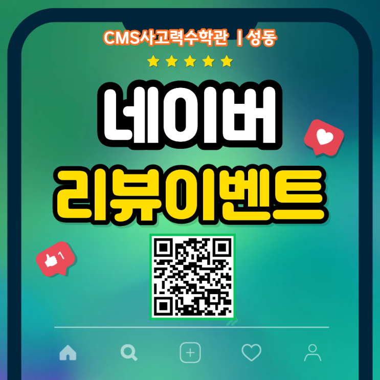 안녕하세요. 성동쌤 입니다 ^0^ 네이버 플레이스에 리뷰를 남겨주시면 감사의 선물을 드립니다. 이벤트 기간 : 2026년 4월 20일(월) ~ 2026년 5월 31일(일) ❣️리뷰 이벤트 참여 방법❣️ 신입생 참여 안내 ① 네이버 "CMS성동" 검색 후 입학테스트 예약 ② 입학테스트 응시 후 결과 상담 및 등록 ③ 네이버 > 마이 > 예약 > 리뷰 작성 ④ 현장 데스크에 작성한 리뷰 보여주면 참여 완료 재원생 참여 안내(영수증 리뷰) ① 여름학기 수강료 결제 후 데스크에 비치된 QR 접속 또는 네이버 플레이스 접속 후 CMS성동 검색 ② 영수증 선택 > 영수증 촬영 > 리뷰 작성 ③ 현장 데스크에 작성한 리뷰 보여주면 참여 완료 준....... <img src="https://blogthumb.pstatic.net/MjAyNjA0MTZfOTkg/MDAxNzc2MzMwNTg4MjEx.SGzrkz8c_hpsvWDm7nH77g4JWPo7x1Rvv8kZC3cFXxsg.G-HWPgmjSHvF6JjItbTKRD-1B63NPiMxEYgqC7rEjNIg.PNG/%C1%A6%B8%F1%C0%BB_%C0%D4%B7%C2%C7%D8%C1%D6%BC%BC%BF%E4._%286%29.png?type=s3" />