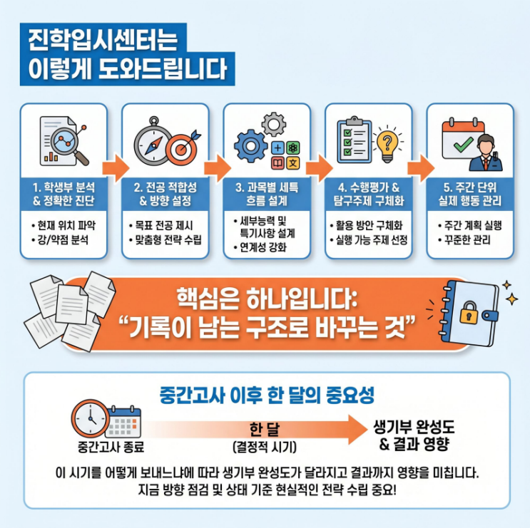 오픈 기념 혜택 진행 중 (15% 할인) 상담 예약: 02-6953-1670 / 문자: 010-4192-1670 세미나 및 상담신청링크 :https://linktr.ee/eduplexjhjg 중간고사가 끝나면 대부분의 학부모님들이 이렇게 생각하십니다. “일단 시험 끝났으니까 좀 쉬게 해야죠” 이 생각, 틀린 건 아닙니다. 하지만 입시 기준에서는 한 가지 문제가 생깁니다. 이 시기부터는 공부량이 아니라 기록의 방향에서 격차가 벌어지기 시작합니다. 실제 상담에서 가장 많이 나오는 질문 “저희 아이는 열심히 하는데, 왜 생기부가 약한 걸까요?” 이 질문을 정말 많이 받습니다. 그런데 학생부를 보면 공통점이 있습니다. 수행평가는 했습니다. 활동도 나름 참여했습니....... <img src="https://blogthumb.pstatic.net/MjAyNjA0MjFfMjU5/MDAxNzc2NzUwODM1NTg0.yAjpvDYmxUvi-IDIjdljCDIf2BoJC-afrZXhaamqX-kg.STb5abPzC69vTnpJ-Owv8CDLJjPawN2Jjpz6XR-BMzAg.PNG/image.png?type=s3" />
