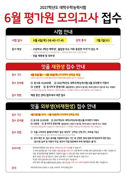 안녕하세요 잇올스파르타 노원 중계센터 2관입니다. 오늘은 2027학년도 6월 평가원 모의고사에 접수 및 안내에 대해 설명드리도록 하겠습니다. 2027학년도 수능 대비 6월 평가원 모의고사 총정리 (일정, 접수, 시험 시간, 유의사항까지!) 수능을 준비하는 수험생이라면 반드시 챙겨야 할 중요한 시험이죠. 바로 6월 평가원 모의고사입니다. 이번 글에서는 시험 일정부터 접수 방법, 시험 시간표, 그리고 꼭 알아야 할 유의사항까지 한 번에 정리해드립니다. 시험 일정 및 기본 정보 2027학년도 대학수학능력시험 대비 6월 모의평가 일정은 다음과 같습니다. 시험일: 6월 4일 (목) 08:40 ~ 17:45 성적 통지: 7월 1일 (수) 응시 대상 고등학교 3학....... <img src="https://blogthumb.pstatic.net/MjAyNjA0MTJfMjY2/MDAxNzc1OTQ3MTkxNzcw.YHALAuICXEx4GHkKxJIKTJXuIuVojT69dYALc1PGE00g.h8ENK9XhSFkTaHRnFyrKT-9u8R_jcX2t4f0MzQiHhPAg.JPEG/1_2027%C7%D0%B3%E2%B5%B5%2B6%C6%F2%2B%C1%A2%BC%F6.jpg?type=s3" />