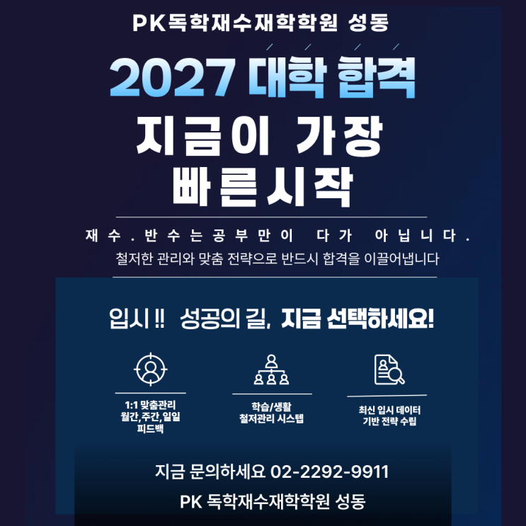 [성동구 독학재수] 아쉬움은 뒤로, 확신만 남기는 2027 반수 성공 전략 "한 번 더 하면, 정말 바뀔 수 있을까?" 대학 강의실에서 창밖을 보며, 혹은 퇴근길 지하철 안에서 이 글을 읽고 계실 여러분. 지금 느끼는 그 아쉬움은 단순히 미련이 아니라, 여러분의 잠재력이 보내는 마지막 신호입니다. 그 간절함을 합격의 기쁨으로 바꿔드리기 위해, 성동구 독학재수 관리 시스템이 2027학년도 반수반을 오픈합니다. 반수의 핵심은 '절대 시간'과 '밀도'입니다 반수생은 재수생보다 시작이 늦습니다. 하지만 이미 수능을 경험해 본 여러분에게는 **'아는 것과 모르는 것을 구분하는 힘'**이 있습니다. ....... <img src="https://blogthumb.pstatic.net/MjAyNjA0MjFfMTcg/MDAxNzc2NzMzNjYxMzk5.rpWJhOJ5drRzk8VvN288dkEiVa8DBRPP78gsy5JmIDkg.Wfqoknk5GQ5MNLlWiVcW2kkzgMoiPYP5t8A-gnQOzQ8g.PNG/%C1%A6%B8%F1%C0%BB_%C0%D4%B7%C2%C7%D8%C1%D6%BC%BC%BF%E4._%284%29.png?type=s3" />