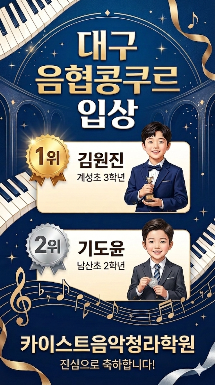 대구에서 가장 권위 있는 콩쿨 중 하나인 대구음협콩쿨에서 저희 남산동 카이스트음악청라학원 학생들이 무려 1위, 2위 동시 수상이라는 값진 결과를 이루었습니다. 정말 쉽지 않은 콩쿨에서 만들어낸 결과이기에 더욱 의미 있고, 아이들의 성장에 깊은 감동을 느낍니다. 수상 결과 1위 김원진 (계성초 3학년) 2위 기도윤 (남산초 2학년) 짧은 시간 안에 만들어낸 결과가 아니라, 꾸준한 연습과 올바른 방향의 지도 속에서 차근차근 쌓아온 실력이 만들어낸 결과입니다. “처음에는 어렵지만, 결국 음악이 흐르게 됩니다” 콩쿨을 준비하는 과정에서 아이들은 처음부터 완벽하지 않습니다. ✔ 악보를 더듬더듬 읽고 ✔ 손가락이 마....... <img src="https://blogthumb.pstatic.net/MjAyNjA0MjdfMjY5/MDAxNzc3MjczNDEyMTEw.XZz031wu9ygY-nO5eufAmmXLrLhA1_oDlmdYcl9sJxkg.oqwNDU322LuqOgsEOw3dtG7hRO0w5PCwdQKV8k6hQ2Eg.PNG/1777273326042.png?type=s3" />