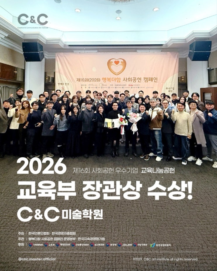 안녕하세요! 서구 애니스타 만화학원입니다~ 기쁜 소식을 하나 전해드려요! 씨앤씨 미술학원 브랜드가 대한민국 사회공헌 우수기업 중 교육나눔공헌 부문에서 무려 교육부장관상을 수상했습니다 "어떻게 이런 의미있는 상을 수상받을 수 있었을까요?" 체계적인 수업 시스템으로 이뤄낸 놀라운 합격률! 학생을 향한 관심 그리고 사랑 또 사회봉사 등 동행하고자 하는 마음이 결과적으로 큰 보답을 받았습니다. 특히 씨앤씨 미술학원 중 광주서구점은 2024년 한국소비자산업평가 미술 부문에서 우수상을 수상하고 애니스타는 2024년 KBS N 브랜드어워즈 만화학원 부문에서 수상한 바가 있어요 앞으로도 씨앤씨 애니스타 미술학원은 입시....... <img src="https://blogthumb.pstatic.net/MjAyNjA0MThfNDgg/MDAxNzc2NTE1OTA0MzIx.o7lQcqS9S6Eyi19t2eiT1FORQyci0ZYaZ5gqSsmjmLMg.hqfzuIWieBCO0A8imMF-1lELK2hja1ULo448a_78FyMg.JPEG/5_0cgUd018svc1bpqrxu6h8jhd_ddh8ve.jpg?type=s3" />