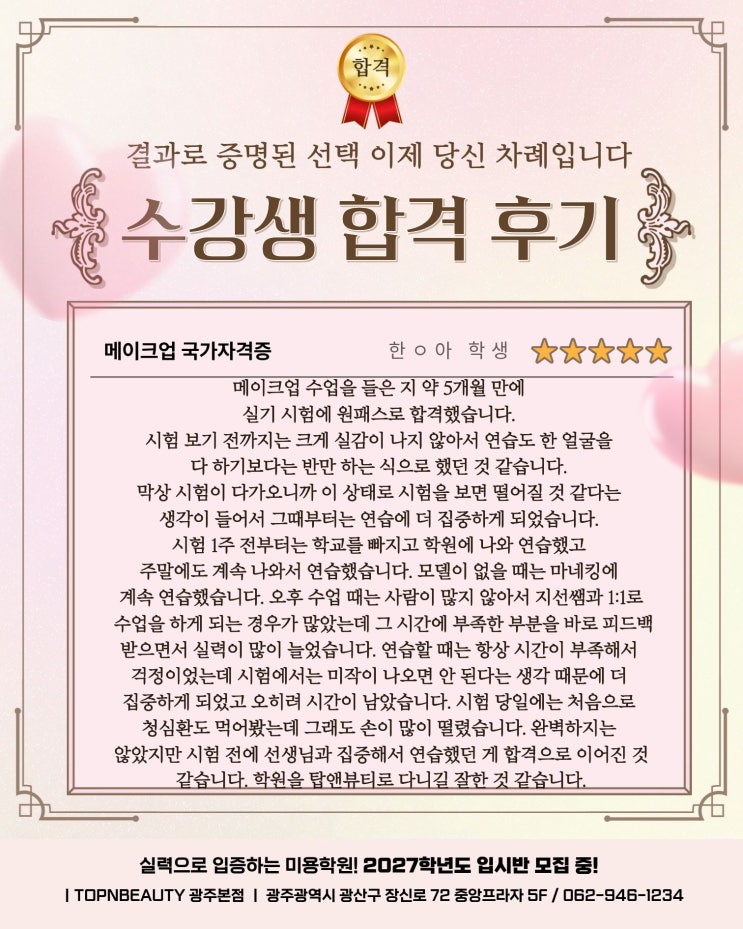 광주미용학원 탑앤뷰티아카데미 / 합격은 우연이 아닙니다 국가자격증 합격 후기 모음