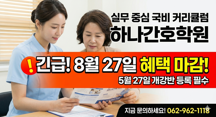 안녕하세요! 하나간호학원입니다. 광주 광산구 지역의 취업 준비생과 새로운 커리어를 꿈꾸는 분들께 초긴급 상황을 전해드립니다. 그동안 광산구가 ‘고용위기 선제 대응지역’으로 지정되어 간호조무사 국비 지원 자비부담금이 대폭 완화되었던 혜택, 다들 알고 계시죠? 그런데 이 역대급 혜택이 적용되는 기간이 딱 8월 27일까지로 입니다! 이 기회가 왜 지금 당장 잡아야 하는 절호의 기회인지, 그리고 왜 하나간호학원 5월 27일 개강반이 그 정답인지 꼼꼼히 정리해 드릴게요. "8월 27일 '개강'하는 국비반까지만 혜택이 적용됩니다!" 많은 분들이 오해하시는 부분이 있습니다. "8월 27일까지만 등록하면 되겠지?&....... <img src="https://blogthumb.pstatic.net/MjAyNjA0MjBfMjU0/MDAxNzc2NjUwNzgyNTQ4.t6c8_2BH7lKhdtPh1FaFAvzFZ_DGPUIryTjAP2dcbygg.Foeq7Kv80_fDuBCED47g9q0zvImeqT_XMDJrQVQjChAg.PNG/Gemini_Generated_Image_1xa20t1xa20t1xa2.png?type=s3" />