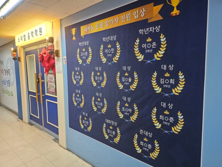 25년 2월~26년 2월(새학기 들어가기 전이 기준) ● 콩쿨 총 14명이 더 단단해지고 더 좋은 성적으로 전원 입상하였습니다♡ ● 급수 총 4명 전원 합격♡ 콩쿨과 급수를 준비하며 한곡을 수십, 수백번 친다는 것이 쉬운 일이 아닌데 그 과정들을 참아내고 좋은 성적을 받은 우리 소리엘 친구들 앞으로도 응원합니다♡ 콩쿨을 위해 정성껏 지도해주신 선생님들께 진심으로 감사드리며, 깊은 존경을 보냅니다♡ <img src="https://blogthumb.pstatic.net/MjAyNjA0MjZfMjk0/MDAxNzc3MjEyMDY3MzY3.DoUJ8onnwowU6u63MeQ1sl9Y0pywDkJf3B1oGhqUugkg.ssOXRtSXswho4YXVW2etfr0JEjwPdHkPak7YRpleRvkg.JPEG/900_20260326_130132.jpg?type=s3" />