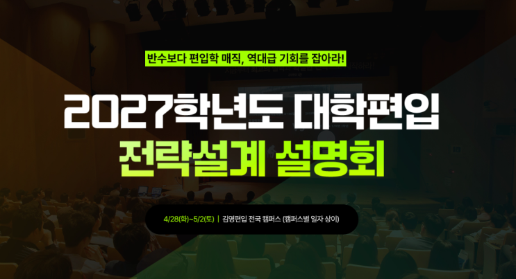 [2027학년도 대학편입 전략설계 설명회] 인서울 편입, 지금 시작해야 하는 이유! 편입을 준비하면서 가장 많이 고민하는 부분은 “언제 시작해야 할까?”입니다. 하지만 실제로 더 중요한 것은 언제보다 ‘어떻게 시작하느냐’입니다. 김영편입 대전캠퍼스에서는 인서울 편입을 준비하는 수험생을 위해 '2027학년도 대학편입 전략 설계 설명회'를 준비했습니다. 설명회 신청 바로가기! https://www.kimyoung.co.kr/presentation/2026/20260425_main_full.asp#n1 편입 준비에 필요한 전반적인 방향과 정보를 한 자리에서 확인할 수 있는 설명회입니다. 설명회 일정 및 장소 일정: 2026년 5월 1....... <img src="https://blogthumb.pstatic.net/MjAyNjA0MjhfMzkg/MDAxNzc3MzY0MzYwODIx.z9YDzgC4DXFTmIgncQ7GURVuSwuMrGEhmV4_Cp0agykg.66vn2qsR5mo5ts70-_C3O-tOwM7ddPQCC2yRuoqZwfwg.PNG/image.png?type=s3" />