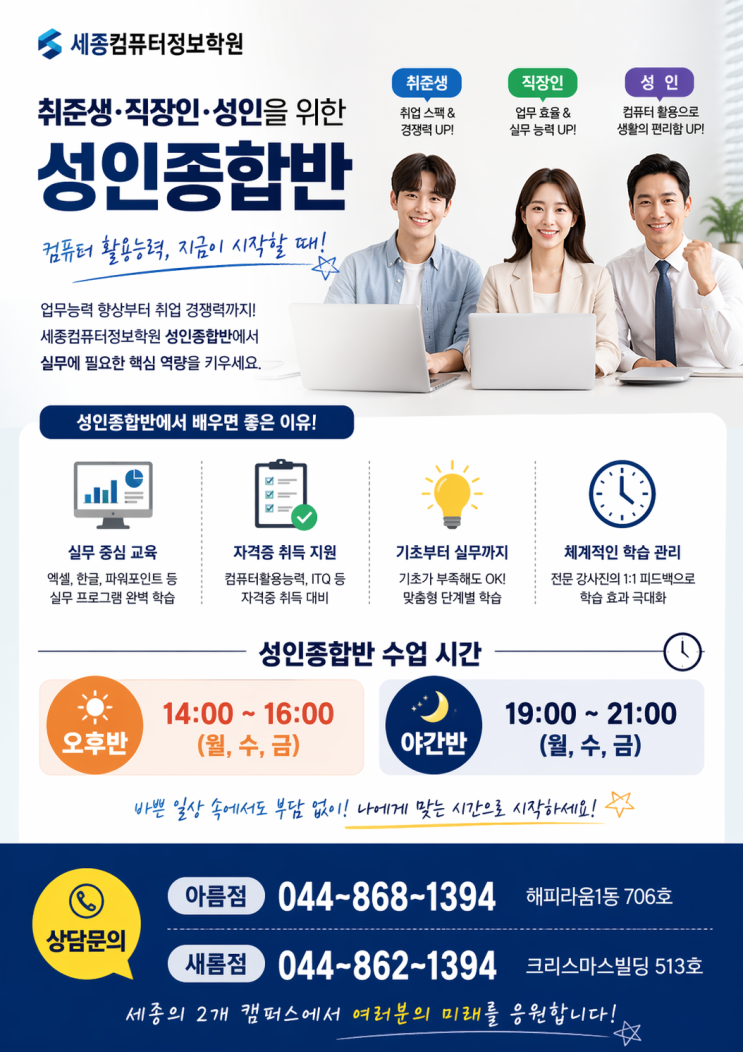 안녕하세요~ 세종시 IT전문 교육기관 세종컴퓨터정보학원입니다^^ 취업 준비를 하거나 직장에서 일을 하다보면 엑셀, 한글, 파워포인트 같은 컴퓨터활용 능력이 정말 중요하다는걸 느끼게 됩니다. 특히 요즘은 많은 기업에서 컴퓨터활용 능력과 OA프로그램 활용 능력을 기본 역량으로 요구하고 있습니다. 어디서부터 시작해야 할지 모르거나, 혼자 공부하기 어려워서 미루고 있었다면 세종시에서 성인 대상 컴퓨터 교육이 가능한 세종컴퓨터정보학원에서 시작하세요! 성인종합반에서는 실무에서 가장 많이 사용하는 엑셀, 한글, 파워포인트 프로그램을 중심으로 교육합니다. 단순 기능만 배우는 것이 아니라, 실무에서 바로 사용할 수 있는 실습....... <img src="https://blogthumb.pstatic.net/MjAyNjA0MjNfMjk4/MDAxNzc2OTA4NzM3Nzkx.c7tBChibaUnuUI1-PGLeJ0W16ehgy9eLc-c4AaHARkYg.MXzjlYp4Gl13f4pF5EMzJPDdVLTCqEVjWBD5xv0REnEg.PNG/%BC%BA%C0%CE%C1%BE%C7%D5_%2815%29.png?type=s3" />