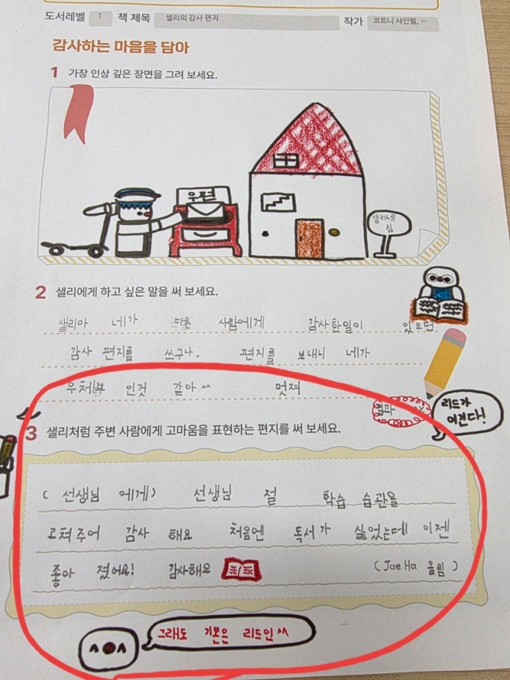 요즘 부쩍 성장중인 우리 친구의 독서노트! 《샐리의 감사 편지》 란 책을 읽고 쓴 독서노트를 통해 나에게 편지를 써주었다. 선생님 절 학습습관을 고쳐주어 감사해요 처음엔 독서가 싫었는데 이젠 좋아졌어요 감사해요 얼마나 감동이고 기쁜 일인지 모른다. 아직은 문법적으로나 높임말 쓰기 등등 아직은 어색하지만 우리 친구가 느끼는 변화가 아주아주 긍정적이고 기특하다. 정말 응원하고 축복해!! <img src="https://blogthumb.pstatic.net/MjAyNjA0MjNfODAg/MDAxNzc2OTQ4NDY2NDk1.uLHe18FLbR0OLWNETYZbnf2keSs5aT4G78k_AU3IXxgg.PFTFBfSBe8Z-cGVpd80IpHzRUPryPJjXhtsDchLy80kg.JPEG/900_1776847986437.jpg?type=s3" />