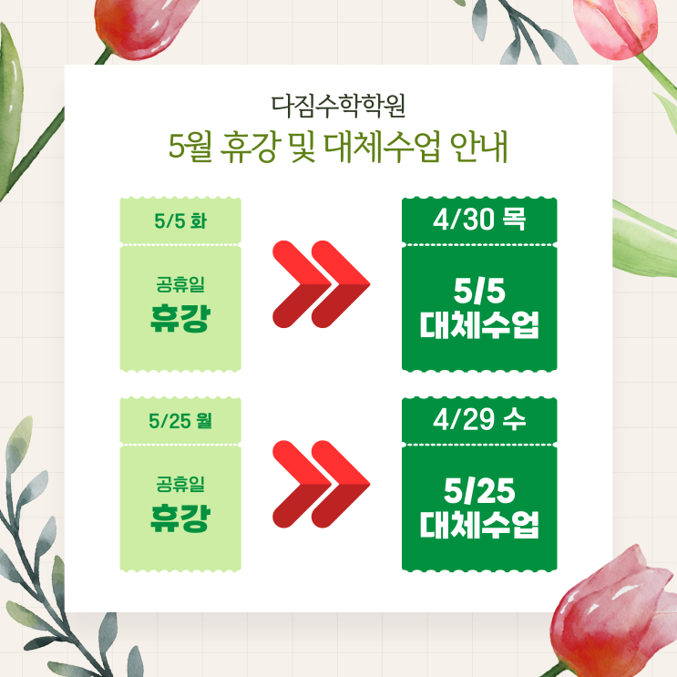 안녕하세요 :) 다짐수학학원입니다. 5월은 공휴일이 포함되어 있어 일부 수업 일정이 조정되어 안내드립니다. 다짐수학학원은 월 8회 수업을 기준으로 운영하고 있습니다. 따라서 공휴일로 인해 쉬는 수업은 다른 날짜에 대체수업으로 진행하여 정해진 수업 횟수를 그대로 유지하고 있습니다. ✅ 이번 5월에도 휴강이 있는 대신, 4월 중 수업 가능한 날짜에 미리 대체수업을 진행하게 되었습니다. 학생들의 학습 흐름이 끊기지 않도록 조정한 일정이니 아래 내용을 꼭 확인해주시기 바랍니다. 5월 휴강 및 대체수업 일정 5월 5일(화) 공휴일 휴강 ➡ 4월 30일(목) 대체수업 진행 5월 25일(월) 공휴일 휴강 ➡ 4월 29일....... <img src="https://blogthumb.pstatic.net/MjAyNjA0MjFfMTQ0/MDAxNzc2Nzc0Nzk2NDk5.H4b69XQZCntnwVkJ2kTjzrKEp0Eo55k1UfjXpBY17fMg.gY361Uw0KRTgRt-iD7pwlq4rqTwang2YCCwMe_mrW_Eg.PNG/%C1%A6%B8%F1%C0%BB_%C0%D4%B7%C2%C7%D8%C1%D6%BC%BC%BF%E4._%281%29.png?type=s3" />