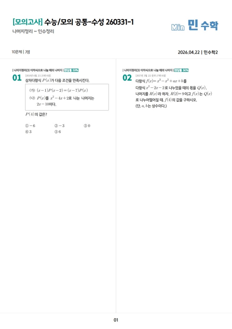 (민수학) 고등부 수학 밀착 관리 수업 안내 안녕하세요, 개인별 맞춤 전략으로 실력을 완성하는 민수학입니다. 단순한 문제 풀이를 넘어, 학교별 특성에 맞춘 철저한 분석으로 성적 향상을 이끌어냅니다. 1️⃣ 학교 프린트 완벽 분석 & "적중 변형 문제" 제공 학교별 부교재 및 프린트 전수 조사: 학교에서 배부된 유인물과 부교재의 모든 문항을 완벽하게 분석합니다. 고퀄리티 변형 문제 제작: 시험에 그대로 나오지 않는 변형 문제의 특성을 고려하여, 숫자 변형부터 조건 변형까지 다양한 유형의 유사 문항을 직접 제작하여 배부합니다. (오늘 공유해 드린 나머지 정리 변형 문제와 같은 퀄리티를 보장합니다!) 2️⃣ 1:....... <img src="https://blogthumb.pstatic.net/MjAyNjA0MjJfMjcy/MDAxNzc2Nzg4NTYyMDgz.P7CTHp-E4HCWVaYS_jvo3wlyrn9Nkux1f793OW4S8LEg.diP6jjIfi1s9ihlCgmj5qAJU9amWCYj5Oo377WrotCsg.JPEG/260331_%BC%F6%B4%C9%B8%F0%C0%C7_%B0%F8%C5%EB-%BC%F6%BC%BA_260331-1_%B9%CE%BC%F6%C7%D02_%B9%AE%C1%A6%C1%F6_1.jpg?type=s3" />