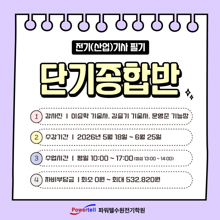 안녕하세요 파워텔수원전기학원입니다! 꽃샘추위로 쌀쌀한 날씨 감기 조심하시구요! 오늘은 국비지원이 가능한 전기(산업)기사 단기종합반!! 개강안내 드리려고 합니다! 이번 전기(산업)기사 단기종합반은 5월 18일에 개강하고, 회로이론, 제어공학, 전기자기학, 전력공학, 전기기기, 전기설비기술기준 총 여섯 과목을 약 6주에 걸쳐 학습하는 과정입니다! 저희 파워텔 수원전기학원에서는 뛰어난 강의력과 기술사, 기능장 등! 전문성을 모두 갖춘 강사진과, 최신기출문제를 분석하여 자체 제작한 교재를 통하여 중요한 부분을 이해하기 쉽게! 준비하실 수 있도록 도와드립니다! 저희 파워텔 수원전기학원은 최대한 많은 수강생이 합격하실 수 있....... <img src="https://blogthumb.pstatic.net/MjAyNjA0MjhfNiAg/MDAxNzc3MzYwNDI4NTk0.B3VHg3LDYwqii2hknf5V0CAlx8M80wTYi7xAtu5mfNsg.RNe98w3lV3M-AdsiJNBJMQH0wBmlfVmIORnTNRT-ZUcg.PNG/24.png?type=s3" />