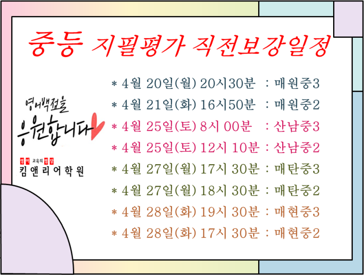 킴앤리어학원 (수원캠퍼스) 중등부 직전보강일
