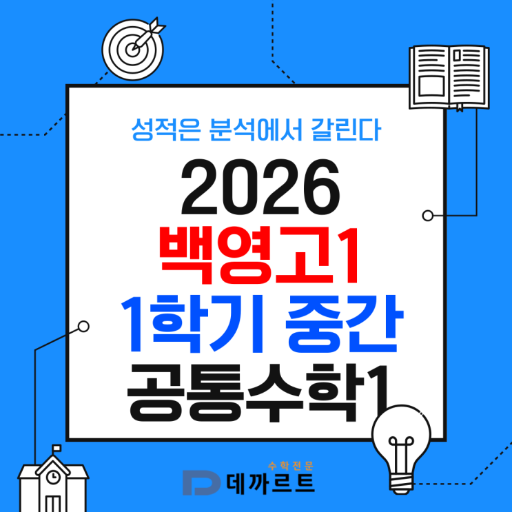 안녕하세요. 데까르트 수학학원입니다. 2026년 4월 23일에 시행된 백영고등학교 1학년 1학기 중간고사 수학 공통수학1 시험 분석을 진행하겠습니다. <문항별 분석> <고난도 문항과 유사 문항> 13번 문항 데까르트 모의고사 고난도 교재 71번과 유사 14번 문항 데까르트 내신빈출 교재 54번과 유사 17번 문항 데까르트 모의고사 고난도 70번 문항과 유사 18번 문항 데까르트 모의고사 고난도 56번과 유사 <시험 총평> 시험 총평 모의고사 고난도 기반 평이한 난이도의 시험 POINT! ① 모의고사 문항 변형 문제 다수 출제 ② 빠르게 풀이 접근이 어려우면 시간이 부족 ③ 객관식 마지막 에 고난도 문항 출제 서술형은 평이한 난....... <img src="https://blogthumb.pstatic.net/MjAyNjA0MjNfNzAg/MDAxNzc2OTI2ODEzMzQx.ZfxxIHzfgsBKIxrI26Wkdl8rM_4CGrC2-5q9jXy-y24g.Oh3GXAeMD0LrSWgwMseiAAJDiuVTUa3vGlVbjJxXopwg.PNG/001.png?type=s3" />