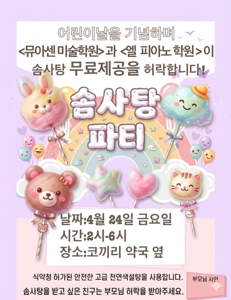 안녕하세요^^ 벌말초 내동초 근처 엘 피아노 음악학원 입니다. 어린이날을 맞아 조금 이른 어린이날 행사를 벌말초 내동초 근처 엘 피아노 음악학원에서 엽니다. 다름아닌 캐릭터 솜사탕 파티~~ 벌말초 내동초 근처 엘 피아노 음악학원에서는 먹어도 된다는 부모님 사인을 받아 오거나, 부모님과 함께 오면, 누구에게나 솜사탕을 드립니다^^ 행복한 어린이날을 맞아~~ 우리 엘둥이들이, 좋아하는 솜사탕을 먹으며 행복할 것을 상상하며 준비했어요~~ 오늘 하루, 너희들이 솜사탕으로 인해 행복하길 바래~♡♡ 우리아이 첫 피아노수업은 시간 정원제 수업으로 탄탄한 평촌동 벌말초, 나눔초, 의왕내손동 내동초 옆 엘 피아노 음악학원으로 오....... <img src="https://blogthumb.pstatic.net/MjAyNjA0MjNfNzEg/MDAxNzc2OTQ4NjE4OTk4.sGi0Z_rbdxetUJTA48PIOPJBibpSCW0y4DiEZ0nBBJAg.jQFuuIY_163ssxNP3_ccpmRKBMmyMX0-S9YgpqzFd6kg.JPEG/1776590907034.jpg?type=s3" />
