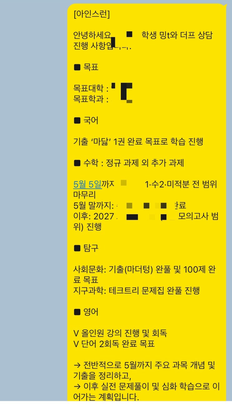 밍t와 상담이 진행되었습니다 4월까지 공부 상황 파악 및 5월 구체적 계획 개별 상담 완료 되어 학생 및 학부모님께 문자/카톡 발송 되었습니다 <img src="https://blogthumb.pstatic.net/MjAyNjA0MjZfMjgz/MDAxNzc3MTkzMDU1MDI3.R9FK88dYxpjc0c4_0MvP-sZ1InCJGRe-l_GPCdtB31Qg.4W1Q7ip26s3kTI3w__9wMV0_CFMM_J3Gy-YGOI-2v7Eg.JPEG/KakaoTalk_20260426_011208919.jpg?type=s3" />