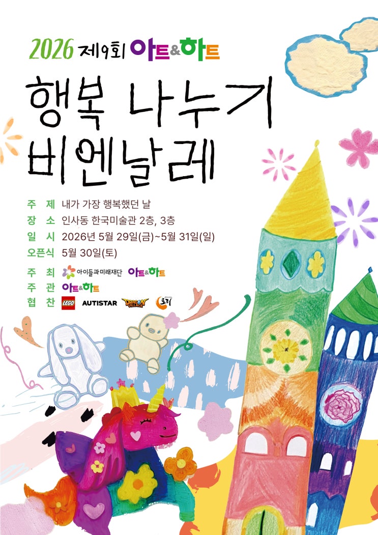 아이의 그림이 전시가 되는 경험, 상상해 보신 적 있으신가요? 아트앤하트에서는 2년에 한 번, 아이들이 직접 참여하는 뜻깊은 전시가 열립니다. 바로 행복나누기 비엔날레 입니다. 이번 전시의 주제는 “내가 가장 행복했던 날” 아이들은 자신에게 가장 의미 있었던 순간을 떠올리고 그 기억을 그림으로 표현합니다. 단순히 그림을 그리는 활동을 넘어 자신의 경험과 감정을 돌아보고 표현하는 과정이 됩니다. 그림이 작품이 되는 경험 전시회는 인사동 한국미술관에서 진행되며 아이들은 자신의 작품이 실제 전시장에 걸리는 특별한 경험을 하게 됩니다. 작품 옆에는 작가 이름이 함께 소개되고 전시장을 찾은 관람객들이 작품을 감상합....... <img src="https://blogthumb.pstatic.net/MjAyNjAzMjZfMTYz/MDAxNzc0NTExMjU1NDYz.OH6VlVSFHv1kRaq2KnK9iiXN8xRTgPHZj2yJcyAx8fog.UORNUcKOVWC-CLFyzLzFiYnrzIn1wia4qFfyLKjG-Zkg.JPEG/2026-%C7%E0%BA%B9%C0%FC-%B8%DE%C0%CE%C6%F7%BD%BA%C5%CD_%C3%D6%C1%BE.jpg?type=s3" />