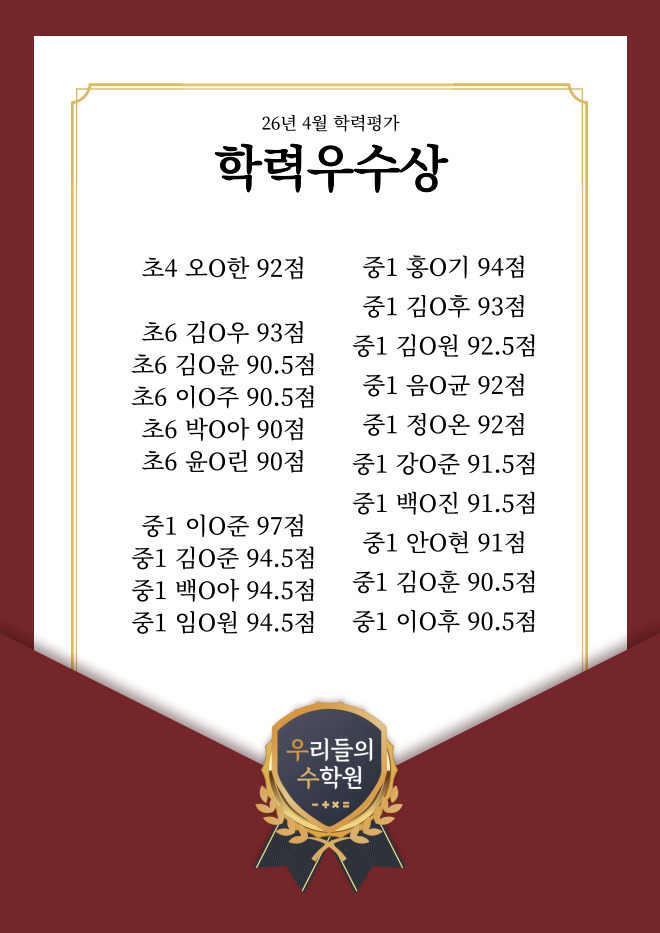 안녕하세요 우리들의 수학원입니다. 이번 4월 학력평가에서 우리 학생들이 정말 좋은 결과를 보여주었습니다! 열심히 준비했던 시간들이 결과로 이어진 만큼 저희도 함께 기쁜 마음으로 이 소식을 전합니다. 이번 시험에서 각자의 자리에서 꾸준히 노력해온 학생들이 눈에 띄는 성과를 보여주었습니다. 특히 평소 약점이었던 부분을 끝까지 포기하지 않고 잡아가면서 성적 향상으로 이어진 점이 인상적이었습니다. 한 문제 한 문제를 그냥 넘기지 않고 왜 틀렸는지, 어떻게 풀어야 하는지 스스로 고민하고 정리했던 과정이 이번 결과의 가장 큰 이유였던 것 같습니다. 좋은 성적도 물론 중요하지만, 그보다 더 의미 있었던 건 학생들의 공부하는....... <img src="https://blogthumb.pstatic.net/MjAyNjA0MjlfNDYg/MDAxNzc3NDU4MDc3Mzgx.EzjnK6o-A6IxF6aEdUbMCf3Sd7bsFQnkDOi8RD81t6Qg.Xl2U9w4WGJ2JXYjFKxQM6GF7Rt7B7CyQHgY2b7wK6tEg.JPEG/4%BF%F9_%C7%D0%C6%F2.jpg?type=s3" />
