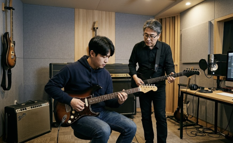 "유튜브 따라 하면 되는 줄 알았는데, 손은 따라가는데 소리가 영 딴판이네요." 영상은 결과만 보여줘요, 그 사이에 빠진 디테일이 진짜 실력을 가르거든요. "리프 하나 외우면 그 곡만 치고 끝, 다음 곡에서 또 처음부터 헤매요." 외우는 공부랑 익히는 연주는 뇌 쓰는 부위 자체가 다르답니다. "어차피 취미인데 대충 즐기면 되지, 뭘 그렇게까지 해야 하나 싶어요." 즐기려면 최소한 '내 귀가 납득하는 소리'는 나와야 그다음이 재밌어지는 거죠. 일렉기타는 통기타보다 진입장벽이 낮아 보이지만, 사실 벽이 뒤쪽에 숨어 있는 악기예요. 그 벽을 모르고 달리면, 6개월 뒤쯤 거울 앞에서 포즈만 잡고....... <img src="https://blogthumb.pstatic.net/MjAyNjA0MjNfODkg/MDAxNzc2OTM0NDQyNDY2.Xxn3wHdXamsT0WPodEQFA3dEZljyqPHtQRdsx9-usQkg.GqsNUtEny4FjdATbIvi4vgtSmWz6exYVVecc4mzaAQ4g.PNG/image.png?type=s3" />