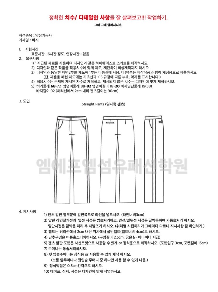 안녕하세요 엠에프엠 섬유패션학원 입니다 화창해진 날씨와 더불어 어느새 2회 실기 접수가 코앞으로 다가왔네요. 딱 놀러다니기 좋은 날씨에 우린 자격증 준비를 열심히 해야겠죠 ㅎㅎ 1회에는 스커트가 너왔으니 이번 2회에는 자켓이나 바지가 나올거라 예상되지만.. 사실 스커트가 연속으로 3회 나온 적도 있었습니다 ㅎ 최근 2년 동안은 2회에 자켓이 나왔으니. 조심스레 이번에는 바지가 나오지 않을까 싶네요(추측이니 틀려도 혼내지마세요) 이건 일자팬츠 도식화 및 지시사항을 요약해 놓은 겁니다 참고해서 시험준비하시는데 도움 되셨으면 합니다 ◾️ 엠에프엠섬유패션학원 ◾️한국폴리텍영남융합술캠퍼스 위탁교육 패턴 강의 ◽️ 양....... <img src="https://blogthumb.pstatic.net/MjAyNjA0MTZfMjY2/MDAxNzc2MzQ2OTQzODgw.B7wBzdkQ8jZMd9GnmE6UFB3g-g5Q6jp9JQ7DqKCM8Qgg.Cc69JYtfVj04SSPPXPIicIG2CXyu1E-wzYE6ld4sMbIg.JPEG/1776346860384.jpg?type=s3" />