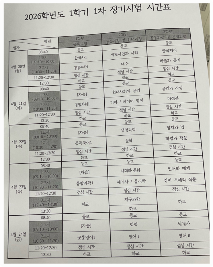 2026학년 1학기 1차 지필평가 일정(광동고)