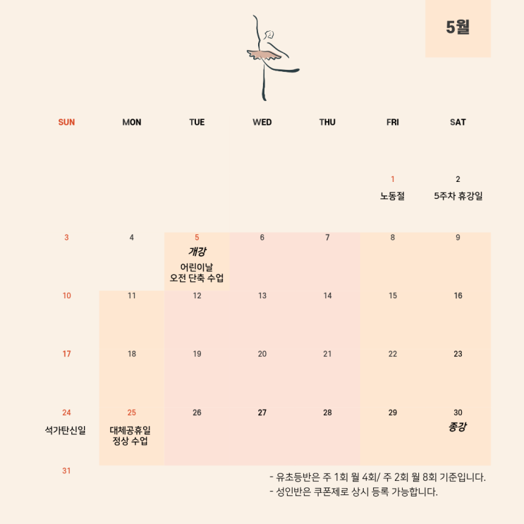 ■ 5월 5일(화) 개강 ~ 5월 30일(토) 종강 ■ 4월 30일(목) - 5월 4일(월) 5주차 및 노동절 휴무 ※ 유·초등부는 월 4주차 수업으로 진행됩니다. ※ 정원제 수업으로 진행되오니 매월 3주차 재등록 기간에 미리 수강신청 해주시기 바랍니다. ※ 보강은 해당 월 이내 주 3회 3번, 주 2회 2번, 주 1회 1번에 한하여 가능합니다. (수강권 이월 불가) 더발라레필 발레&필라테스 석촌점 문의: 010-4092-9043 카카오톡: ballarepil9043 서울시 송파구 백제고분로41길 20 2층 더발라레필발레학원 <img src="https://blogthumb.pstatic.net/MjAyNjA0MjNfNjAg/MDAxNzc2OTI2Mzc5NDg0.uVwXXrlbd3nMW1Q1kzbZB8eeWAUq5O-KmV9Jfuef5Rwg.1hLTnYuCUmfj2dmv5DdPNtSb_49Ie06zolhZZ-xXXXUg.PNG/4.png?type=s3" />