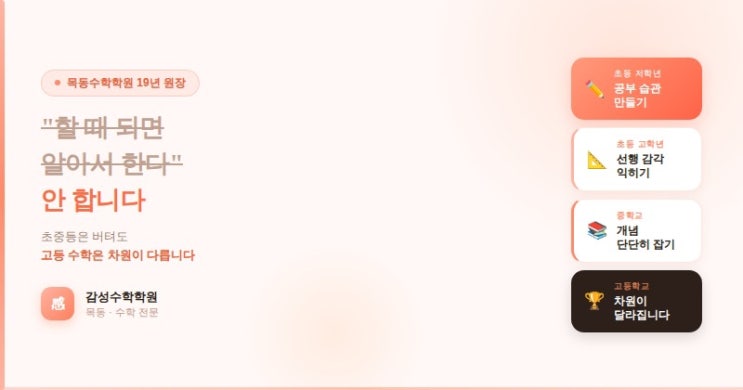 “애들은 때가 되면 알아서 해요.” “너무 어릴 때부터 공부 시키면 번아웃 와요.” “고등학교 가서 해도 될 아이는 된다던데요” 오늘은 제가 요즘 느끼는 것에 대해서 써보려고 합니다. 목동은 학군지라는 특수성을 가지고 있는 곳입니다. 자녀에게 공부를 시키려는 의지를 가진 학부모님들이 모인 곳이라는 이야기입니다. 그런데 19년째 목동에서 수학을 가르치며 학부모님들과 상담을 하면서 요즘들어 유독 초등 부모님들에게서 저 이야기를 많이 듣습니다. 수학학원을 운영하며 아이와 부모님들과 소통하는 교육을 지향하고 있는데 왠지 요즘 저 이야기를 들을때마다 마음 한켠이 답답해짐을 느끼고 있었는데 교육 유튜브를 보다가 어느 댓....... <img src="https://blogthumb.pstatic.net/MjAyNjA0MjNfMTA4/MDAxNzc2OTA4MTg3MjAx.p3bMOMd0zKbDwu6ihJrl9Ser6r6I9h-Dhseh99NbvO4g.ifHGogA41gJWMsAFHo4WKOY78xJRcEGP7LF0ovUoaB0g.JPEG/IMG%A3%DF2674.JPG?type=s3" />