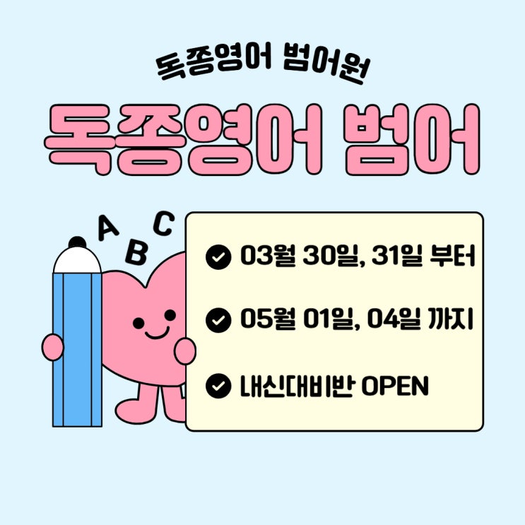 안녕하세요! 독쫑영어 범어원입니다. 오늘은 중등부 내신대비 가능 학교와 일정을 안내드리도록하겠습니다 중등부 내신대비 일정 3월 30일, 31일 부터 ~ 5월 01, 04 까지 다음으로는 내신대비 가능학교 리스트입니다. 중등부 1학년 내신대비 정화중, 소선여중, 황금중, 계성중 오성중, 성광중, 대구동중, 대륜중 동도중, 경신중, 동원중 중등부 2학년 내신대비 경신중, 동도중, 능인중, 동부중 범물중, 성광중, 소선여중, 오성중 정화중, 지산중, 덕원중 신명여중, 대구동중, 대륜중, 황금중 중등부 3학년 내신대비 경신중, 계성중, 고산중, 대구동중 덕원중, 동부중, 소선여중, 신명여중 오성중, 정화중, 황금중, 경명여중 중등부 비내신 학교리....... <img src="https://blogthumb.pstatic.net/MjAyNjA0MTBfMTU4/MDAxNzc1ODAzNjA0Nzcy.HCLUtY1NCrECZTEYcd71A6evyjHe9QkeEuy6ha5tTCYg.-AUH2zaWzO-Crdlnuy6WA2DjEoq8_7hMukFhhVpna0og.JPEG/%C1%A6%B8%F1%C0%BB_%C0%D4%B7%C2%C7%D8%C1%D6%BC%BC%BF%E4_-001.jpg?type=s3" />