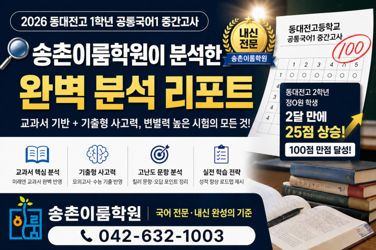 노력은 학생이! 방향은 송촌이룸학원이! 안녕하세요 송촌동 일대 국어를 가장 잘 지도하고, 정확하게 분석하는 송촌이룸학원입니다. 지난 4월 24일 시행된 동대전고등학교 1학년 공통국어1 중간고사는 단순한 학교 시험이 아니었습니다. ❗ “교과서 기반 + 수능형 사고력 + 실전 적용 능력”을 동시에 요구한 시험 이번 글에서는 ✔ 시험의 본질적인 구조 ✔ 문항별 핵심 분석 ✔ 앞으로 반드시 필요한 공부 전략 ✔ 실제 성적 상승 사례 까지 입시 전문가 관점에서 깊이 있게 정리해드립니다. 1. 시험 총평 – “암기형 국어의 완전한 종료” 이번 시험을 한 줄로 정리하면: “아는 학생이 아니라, 적용할 수 있는 학생을 선별한 시....... <img src="https://blogthumb.pstatic.net/MjAyNjA0MjdfMyAg/MDAxNzc3MzAxODc1NDYx.o-to-Sx2Z6aBsQjy28EVW7TIzeG-ItqKHba3HOLWmesg.rwXlJtSV058UV6B47tq-ksoZ7Lky7WAYA5405Elj3kwg.PNG/ChatGPT_Image_2026%B3%E2_4%BF%F9_27%C0%CF_%BF%C0%C8%C4_11_29_56.png?type=s3" />