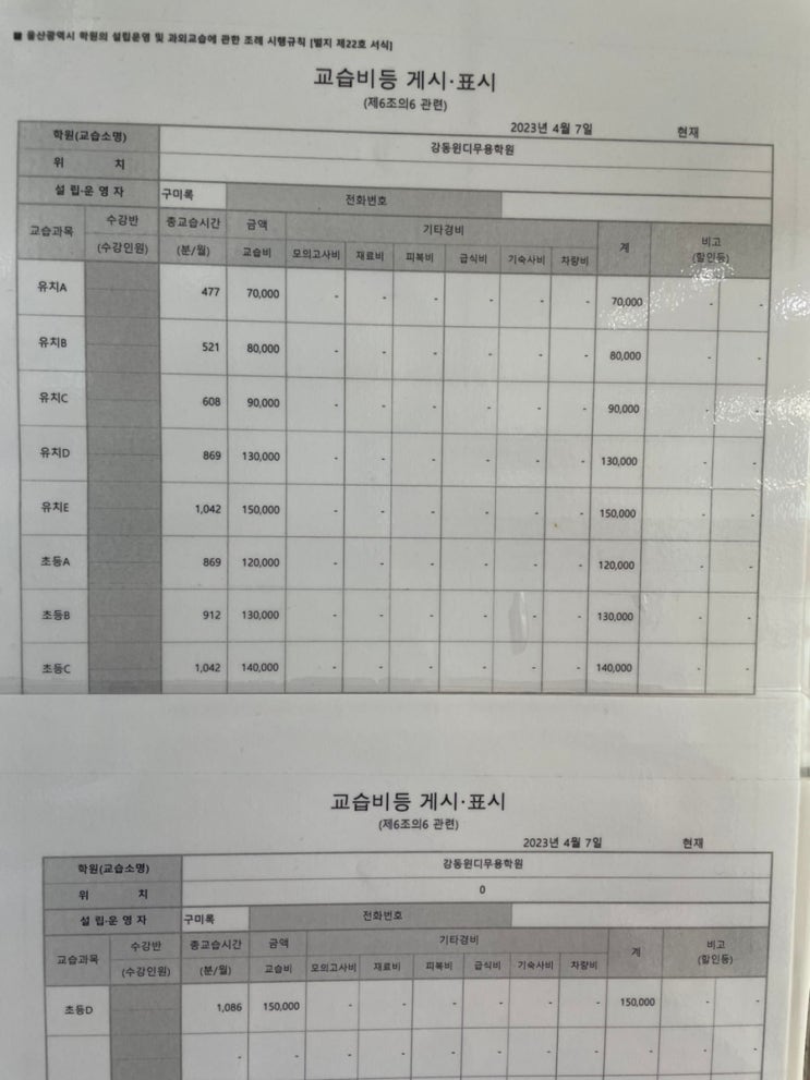 윈지무용학원 교습비 안내