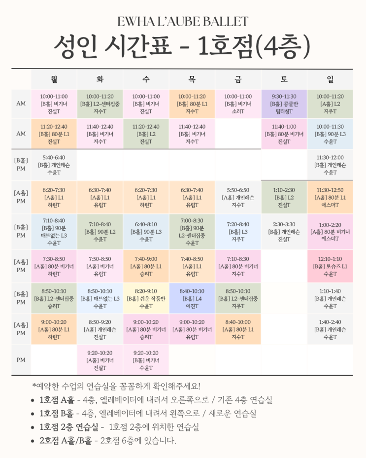 프리미엄 발레 스튜디오 이화로브발레 5월 수강안내 성인 유아, 학생 따스한 봄 햇살을 지나 어느덧 푸르른 녹음이 짙어지는 싱그러운 5월이 다가왔습니다. 가정의 달을 맞아 주변 사람들을 챙기느라 마음이 분주해지는 시기이지만, 이화로브발레와 함께 오롯이 나에게 그리고 우리 아이의 성장에 집중하는 뜻깊은 시간을 만들어보시는 건 어떨까요? 성인반 5월 수강안내 [바쁜 일상 속, 나만을 위한 완벽한 스케줄] "일 하느라 정신없는데 운동할 수 있을까?" 고민하지 마세요! 옷차림이 가벼워지는 계절을 앞두고, 서울 최다 수업을 진행하는 이화로브발레가 여러분의 시간을 지켜드립니다. 월 400여 개 이상의 압도적인 클래스 스케....... <img src="https://blogthumb.pstatic.net/MjAyNjA0MjdfMTE4/MDAxNzc3MjYyMDE2MzY2.u95DRuHBYFA7TffeZ45UAUdZR_8nCag0visD6B4Ld2Eg.Q3mryMfPRM1n5Usxz2sGQE8QBdK0OYEV9LNBiMjlvaQg.PNG/%BD%C3%B0%A3%C7%A5_%B9%D7_%C4%BF%B8%AE%C5%A7%B7%B3_%2844%29.png?type=s3" />