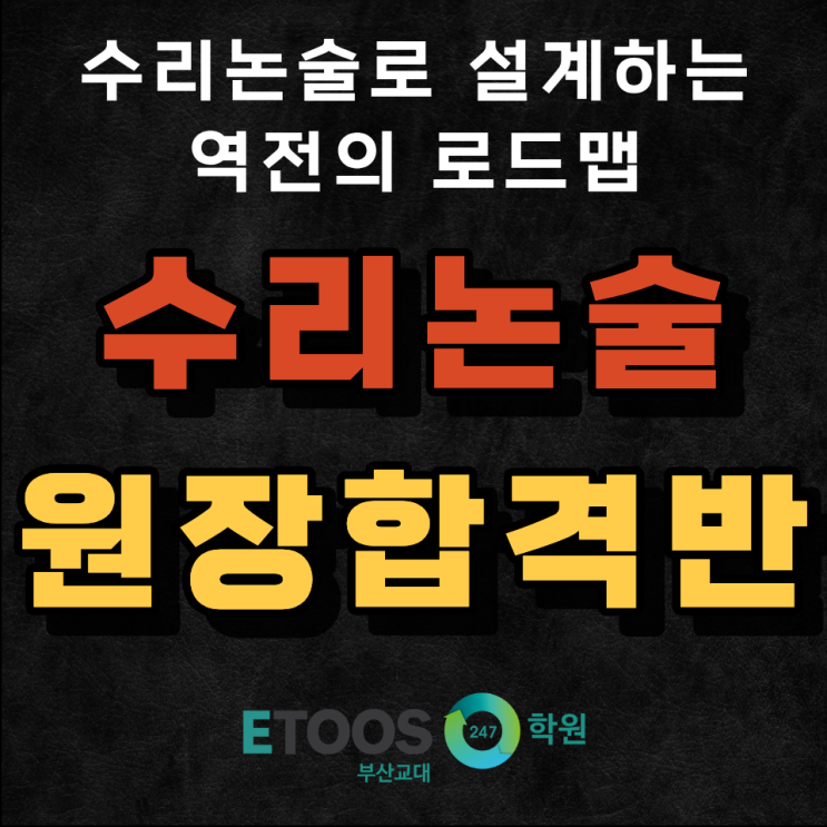 안녕하세요. 이투스247 부산교대점입니다. 저희 학원은 부산 동래, 연제구에서 5년 연속 수업정원의 40~60%의 수리논술 합격자를 배출한 명문으로 유명합니다. 오늘은 높은 합격률의 비결은 무엇인지 가감없이 공개하겠습니다! 자세한 내용은 아래에서 만나보시죠! 수많은 입시 학원들이 '합격'을 말하지만, 합격 전형을 투명하게 공개하는 곳은 의외로 많지 않습니다. 학종, 교과, 정시 합격자를 모두 섞어 수리논술 결과인 듯 포장하는 곳들과는 차원이 다릅니다. 이투스247 부산교대점은 오직 수리논술 전형 합격자만을, 그것도 5년 연속 실명으로 공개하며 입소문만으로 성장해왔습니다. 의치약학 계열부터 최상위권 대학까지....... <img src="https://blogthumb.pstatic.net/MjAyNjA0MTdfOTgg/MDAxNzc2NDIwNjgxMjAz.mgZzCLsIquD6RjyxnsL7KSDXXZol0b1cXQcw0133B9kg.IiKlesyQttCIqBkx31D__QV6g8Hal0oe4_w0XrwIl20g.PNG/%BC%F6%B8%AE%B3%ED%BC%FA.png?type=s3" />