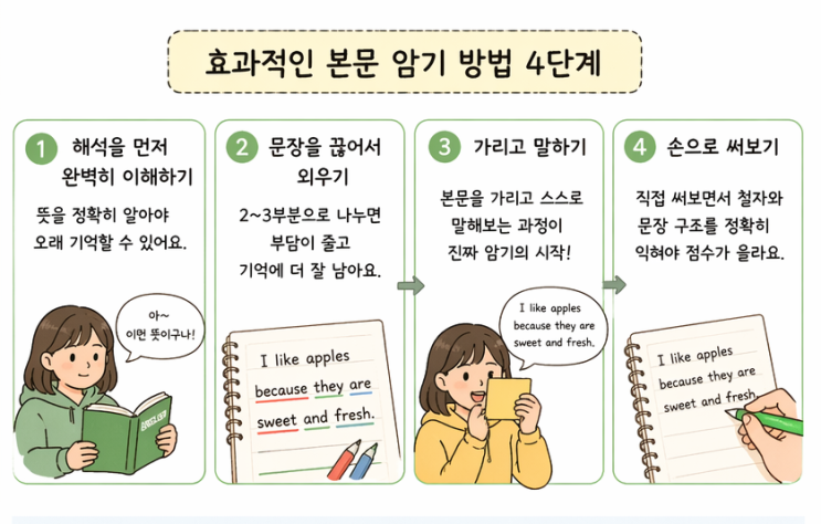 학원 신입 학생들을 위한 현실적인 영어 암기 방법 중간고사 시즌이 되면 학생들이 자주 묻는다. “왜 학원 오래 다닌 애들은 본문을 그렇게 잘 외우나요?” “저는 단어도 많은데 본문까지 외우려니까 너무 힘들어요.” 이건 머리 차이가 아니라 방법과 익숙함의 차이다. 처음부터 잘 외우는 학생은 거의 없다. 다만 효율적인 방법을 아느냐의 문제다. 본문 암기가 어려운 이유 신입 학생들이 힘들어하는 이유는 대부분 비슷하다. 단어와 문장을 따로 외우려고 한다 읽으면서 외운다고 착각한다 머릿속으로만 외우고 실제로 써보지 않는다 즉, 열심히는 하지만 방식이 비효율적이다. 2. 효과적인 본문 암기 방법 Step 1. 해석을 먼저 완벽히 이....... <img src="https://blogthumb.pstatic.net/MjAyNjA0MjNfNTkg/MDAxNzc2OTQ2ODEzNTk3.Wn63u-Tv_7-ug3YWvADWI1zdfRIcIVVU7JN51IEykjUg.x447bhoybM1f8dc4v3Fzi1379lZdVLImzWI639biyCwg.PNG/%C8%A3%B0%FA%C0%FB%C0%CE_%BA%BB%B9%AE%BE%CF%B1%E2.png?type=s3" />
