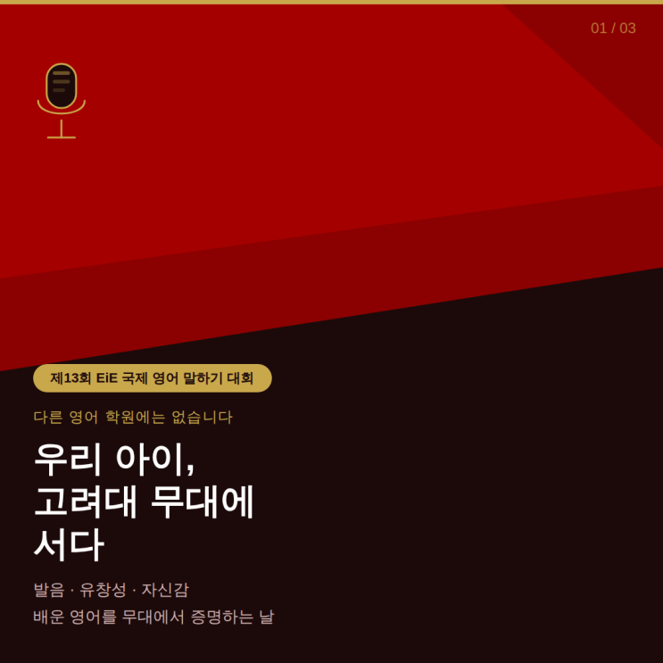 "우리 아이, 고려대 무대에 서다 — EiE 국제 영어 말하기 대회" 영어 실력, 시험지 말고 '무대'로 증명해 보세요. 매년 이맘때면 EiE에는 특별한 일이 생깁니다. 단순히 영어를 배우는 것을 넘어, 아이가 직접 무대에 올라 자신의 언어로 세상에 말을 거는 순간 — 바로 제13회 EiE 국제 영어 말하기 대회입니다. "말할 수 있는 영어"를 가르칩니다 EiE의 수업 철학은 하나입니다. 쓰는 영어가 아니라, 표현하는 영어. 이 대회는 그 철학이 무대 위에서 실제로 펼쳐지는 자리입니다. 아이들은 발음, 유창성, 자신감, 전달력—이 모든 것을 한 번의 스피치로 보여줍니다. 이런 경험, 다른 영어 학원에는 없습니다....... <img src="https://blogthumb.pstatic.net/MjAyNjA0MjVfNzIg/MDAxNzc3MDc5MTYzMjQ2.4Z9H4IB5n8jzOIVTYvhxNotvEmqcv7k6-UIY8IDRruAg.1mZ5UioHT2oL1I7KSfrOQ5YHLiVLJurJJtjnYMgbxmgg.PNG/eie_card1.png?type=s3" />