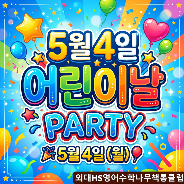 안녕하세요. 외대HS영어수학나무책통클럽입니다. 제목: 5월 4일은 우리들 세상! 미리 만나는 어린이날 파티! 일시: 2026년 5월 4일 (월) 오후1:00 ~ 오후 4:00 대상 : 초등~중1까지(중1은 4시~6시) 주요 프로그램: 각 교실마다 신나는 게임존 노래방존 그동안 모은 포인트로 신나는 마켓데이 맛있는 콜팝 및 스낵 무제한 매주 선생님들과 게임에 대한 회의를 했는데요.. 제일 재밌겠다 싶은 게임들만 엄선해서 두근두근 뭔지 궁금하시죠? 파티날때 오면 알게 될꺼예요^^ 친구초대 가능해요~^^ <img src="https://blogthumb.pstatic.net/MjAyNjA0MjRfNTUg/MDAxNzc3MDEwNjgzNjA4.M71mvFXkADImby7DN1e4TJsoZcNrXeyx03-fNQokBmkg.GhkcLNZPEmV5xFim6U6ebTsZwQLI8yz7iDD2to0Jgc0g.PNG/Gemini_Generated_Image_7hvmrs7hvmrs7hvm.PNG?type=s3" />