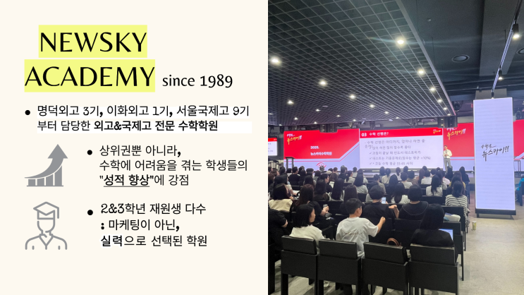 뉴스카이 수학학원은 Since 1989, 명덕외고 3기, 이화외고 1기, 서울국제고 9기부터 함께해온 외고·국제고 수학 전문 학원입니다. 뉴스카이는 단순히 상위권 학생들만 성과를 내는 학원이 아닌, 수학에 어려움을 겪는 학생까지 함께 성장 시키며 꾸준한 성적 향상을 이끌어온 것이 특징입니다. 외고·국제고 학생들이 자주 겪는 수학에 대한 부담과 약점을 보완하며 실질적 성과를 만들어왔고, 그 결과 학생들에게 마케팅이 아닌 실제 실력과 결과를 바탕으로 선택되어 현재 2&3학년 재학생 비율이 높은 학원입니다. 최근 문,이과 구분이 점차 사라지고 대학에서도 통합형 인재를 요구하는 흐름 속에서, 외고·국제고 학생들에게도 수학적 역량....... <img src="https://blogthumb.pstatic.net/MjAyNjA0MjVfNTgg/MDAxNzc3MTAxOTIwNzQ3.PaKzx8QPAHpuuxB-LcQnCupuyjabwgls9X4PTAxEu1og.0GchKbQSuKJ0UWH22egRDW9DdK4Ewta4s2M3dscOanEg.PNG/%B4%BA%BD%BA%C4%AB%C0%CC_%BF%AC%C7%F5.png?type=s3" />