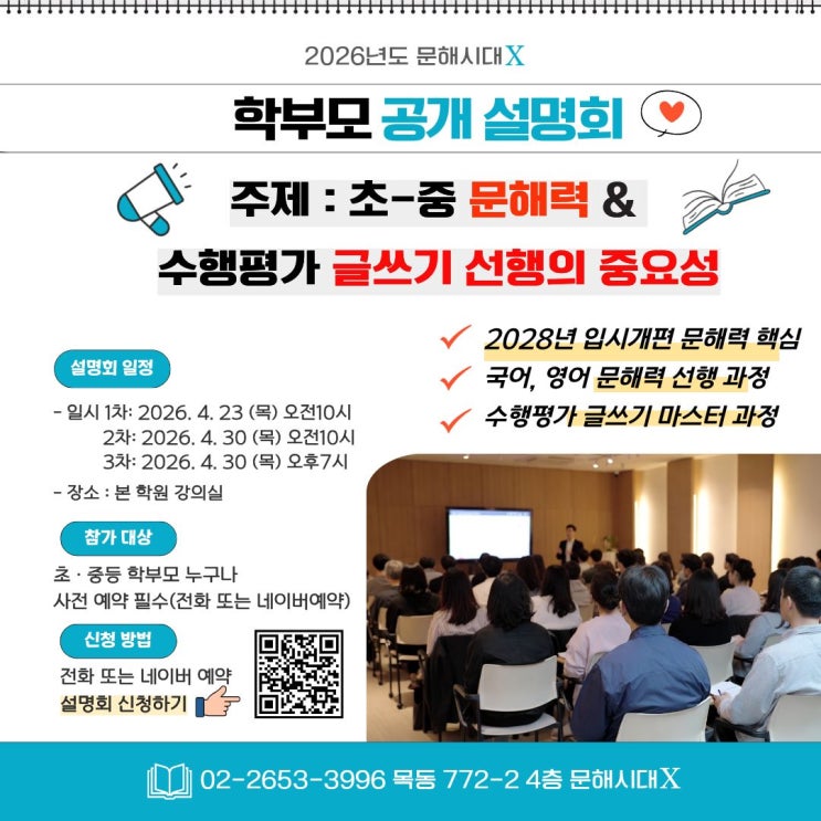 안녕하세요. 문해시대X입니다. 문해시대X에서 이번에 특별한 설명회를 준비했습니다. 요즘 많은 학부모님들께서 이런 고민을 하고 계시죠. "2028년 입시가 바뀐다는데… 우리 아이, 지금 뭘 준비해야 하나요?" 저희는 그 답을 알고 있습니다. 문해시대X는 어떤 곳인가요? "문해력이 답이다" 를 모토로, 초·중·고 학생들에게 능동적이고 실전적인 문해력을 길러주는 시사 토론·논술 전문 학원입니다. 단순히 문제 풀이를 반복하는 것이 아니라, 읽고 이해하고 생각을 글로 표현하는 진짜 실력을 키워드립니다. 왜 지금 문해력인가요? 2028년 입시 개편의 핵심 변화, 이미 들으셨나요? ✅ 수행평가 비중 확대 ✅ 서술형·논술형....... <img src="https://blogthumb.pstatic.net/MjAyNjA0MTVfMjU1/MDAxNzc2MjM0NDg4OTE1.WHNMLjPTShVLo6DJoHZrobJEm_s6ccf8nrVVo10O6rYg.EojZk7jWmSlNngRNBqShHNT-1qPQmxqgT8sba1kx20cg.JPEG/%B8%F1%B5%BF_%B0%F8%B0%B3%BC%B3%B8%ED%C8%B8.jpg?type=s3" />
