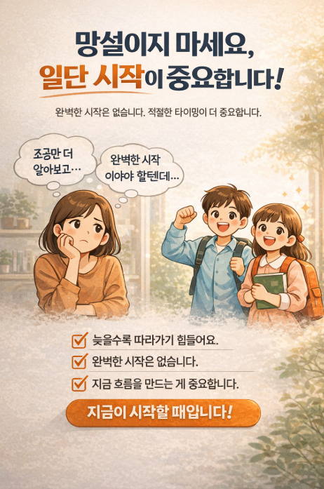 학원을 운영하다 보면 부모님들의 선택이 크게 두 가지로 나뉘는 경우를 많이 봅니다. 너무 어린 시기인데도 조금이라도 더 앞서가야 한다는 생각에 진도를 서두르시는 경우가 있는가 하면, 반대로 “이제는 학원을 보내야 할 것 같은데…” “지금 방식은 아닌 것 같은데…” 하면서도 결정을 미루다가 시간을 보내시는 경우도 많습니다. 요즘은 학원이 워낙 많다 보니 선택이 쉽지 않으실 거라고 생각합니다. 여러 곳을 비교하고, 상담도 충분히 해보시고 신중하게 결정하시려는 마음도 이해가 됩니다. 다만 한 가지는 분명합니다. 모든 곳을 다 알아보고 완벽한 선택을 하는 것은 사실상 어렵습니다. 그리고 부모님이 신중하게 선택하셨더라도....... <img src="https://blogthumb.pstatic.net/MjAyNjA0MTdfMTA2/MDAxNzc2NDE2MDAyNjk3.TK7ABpw8-ihL8aEFTf65Z5Gld3ez9-Nxz_3rCGN0cP8g.4VEOOR2BqIbO0pv4lXg14mmeVAHLKBLgYxe1XkNK1cEg.PNG/image.png?type=s3" />