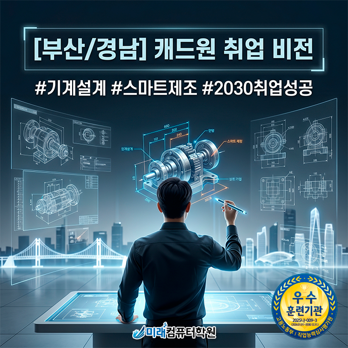안녕하세요! 여러분의 취업 파트너, 미래컴퓨터학원입니다. 최근 부산 서구를 비롯하여 사상구, 강서구 일대의 제조 및 설계 분야 채용 시장이 다시 활기를 띠고 있습니다. 특히 "캐드 실무 능력"은 설계직뿐만 아니라 공정 관리, 인테리어 등 다양한 분야에서 필수 역량으로 꼽히고 있지요. 오늘은 단 20일 만에 캐드 기초부터 자격증까지 정복할 수 있는 알찬 과정을 소개해 드립니다. 01. 부산·경남 설계 분야 고용 동향과 취업 비전 최근 부산 강서구, 사상구 및 김해·양산 산단을 중심으로 스마트 제조 혁신이 가속화되고 있습니다. 이에 따라 단순 오퍼레이터를 넘어, 정확한 도면 해독 능력을 갖춘 "캐드원"의 수요가....... <img src="https://blogthumb.pstatic.net/MjAyNjA0MjBfMjQz/MDAxNzc2NjUyOTExNjk1.pVdV6v6VXZAf8ge1zDSq3q-xCSiKKBGzwREnATsAdb4g.-hteD-BbSLrdRV9tPq4yOoEsbrx2llaGFxjxAxtzZ6Yg.PNG/%BE%C6%C6%AE%BA%B8%B5%E5_1.png?type=s3" />