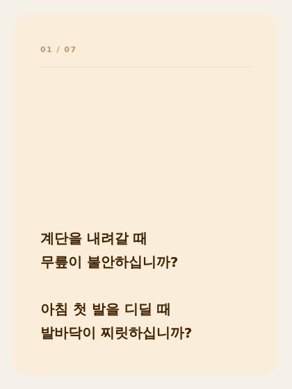 부산 무릎 통증 원인, 발바닥 감각 저하가 시작입니다 (낙상 예방 방법) 아침에 첫 발을 디딜 때 발바닥이 찌릿하신가요? 계단을 내려갈 때 무릎이 불안하게 느껴지시나요? 많은 분들이 이를 단순히 “나이가 들어서 그런 것”이라고 생각하고 넘기지만, 이 증상은 분명한 원인이 있습니다. 단순한 노화가 아니라 몸의 기능 변화에서 시작된 문제입니다. 나이가 들수록 발바닥 감각은 자연스럽게 둔해집니다. 발에는 수많은 감각 수용체가 존재하는데, 이 반응 속도가 느려지면 균형 감각이 떨어지고 몸의 위치를 정확하게 인지하기 어려워집니다. 그 결과 낙상 위험이 증가하고 무릎과 발바닥 통증이 점점 심해지게 됩니다. 즉, 무릎 통증의 원....... <img src="https://blogthumb.pstatic.net/MjAyNjA0MTdfMTA0/MDAxNzc2NDMwNjg3OTQ0.UIBEyrUkJpEnTvPMC079mRXf1ig1z-hy3HXhB5ihkfog.OaOET0tBYUk3-nF1wvQPu6QQFWty5onBQNaSoQmhmukg.JPEG/IMG%A3%DF5368.JPG?type=s3" />