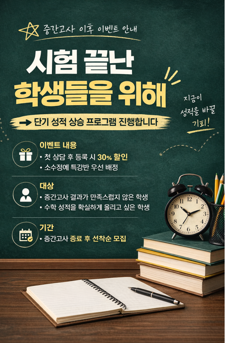 중간고사 시즌입니다. 이미 시험을 본 학생도 있고, 이제 준비 중인 학생도 있습니다. 하지만 중요한 건 하나입니다. 시험이 끝난 이후가 진짜 시작입니다 이런 경험 있지 않습니까? “이번엔 진짜 열심히 했는데 결과가 안 나온다” “문제는 풀리는데 시험만 보면 틀린다” “어디부터 다시 해야 할지 모르겠다” 이건 노력 문제가 아니라 관리와 방향의 문제입니다. 매쓰스토리 국풍2000의 방식 ✔ 집중 관리 → 학생 한 명씩 개별 관리, 성적 상승 구조 설계 → 숙제·오답·학습 시간까지 전부 체크 ✔ 맞춤 특강 → 학생별 부족한 단원만 정확하게 보완 → 시험 범위 내 핵심 유형만 집중 공략 ✔ 기출 분석 → 개념부터....... <img src="https://blogthumb.pstatic.net/MjAyNjA0MDdfMTY3/MDAxNzc1NTQxODE5ODQw.vom6ZLI6u2krKd3Xb_gSJHa1aZNP3kdPwR0ZoHl69N4g.aR9xYZAWhss9_iEDJ9ZVau7L7e-MRz-_pMo0Tb9BW6Mg.PNG/%BA%ED%B7%CE%B1%D7_%C0%CC%B9%EA%C6%AE_%BB%E7%C1%F8_%C3%D6%C1%BE.png?type=s3" />
