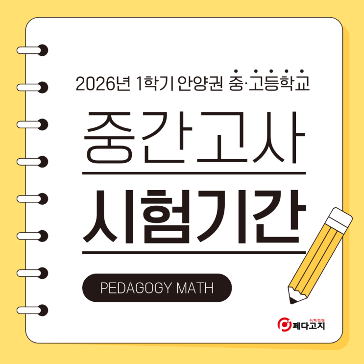 안녕하세요, 평촌학원가 중고등부 수학학원 페다고지수학학원 입니다. 이번 포스팅에서는 안양권 중·고등학교 1학기 1차 정기시험 일정 안내 드리겠습니다. 고등학교 1학기 1차 정기시험 일정 안내 중학교 1학기 1차 정기시험 일정 안내 페다고지에서는 시험 대비 기간 동안 학교별 맞춤 수업과 기출 문제 풀이로 효율적인 학습을 돕고 있습니다. 페다 학생들 모두 좋은 결과를 얻을 수 있도록 끝까지 함께하겠습니다! 페다고지수학학원의 정규수업과 입학절차, 입시 및 내신 프로그램 등에 대해 궁금한 점이 있으시면 언제든지 페다고지로 문의해 주세요. 전화나 문자, 카카오톡 등 편하신 방법으로 문의하실 수 있습니다. 중등관 : 031-388-888....... <img src="https://blogthumb.pstatic.net/MjAyNjA0MTZfNTYg/MDAxNzc2MzI0Mjc5Mjgz.zoYaqMV8vYr0RGxeMCazNLXUOGrEYrjp_VJjOg-DrOcg.133lPekO6tnTMBU8Fk854L2moLVdzAsL3S5LNeglKK8g.PNG/%BD%C3%C7%E8%B1%E2%B0%A3%BD%E6%B3%D7%C0%CF_%281%29.png?type=s3" />