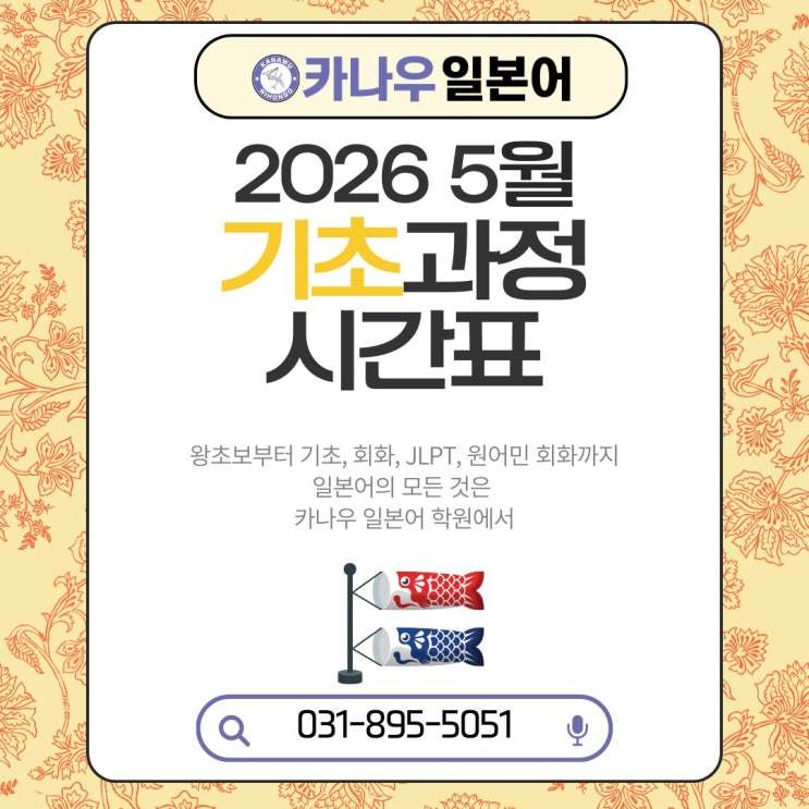 [왕초보/기초과정] 일본어 공부의 모든 것, 카나우 일본어 학원 26년 5월 시간표 꿈이 이루어지는 곳, [夢がかなう所、かなう日本語] 카나우 일본어 학원은 왕초보부터 기초, 회화, JLPT, 원어민 회화 JPT, SJPT, 미디어, 애니메이션, 주니어, 외고내신, 유학EJU올인원, 한자 등 일본어의 모든 것을 가르치는 일본어 전문 학원 입니다 따뜻해진 날씨만큼 새로운 시작들이 함께하는 26년 5월 카나우 일본어 학원에서 일본어 공부도 다시 힘차게 시작해볼까요? (본 글에서는 기초과정의 수업 과정 및 가격, 수강료까지 안내드립니다!) 월요일부터 일요일까지 모든 요일에 수업이 진행되고 있습니다! --KANAWU POINT-- ✨카나우를 선택할 수 밖에 없....... <img src="https://blogthumb.pstatic.net/MjAyNjA0MTlfMjMg/MDAxNzc2NTY1MTQyMzc2.1VPDHtwG3kIhJjCrc19yaNsRcEYN7hTE6qdC5HQGV0gg.kExFgw7bMJYiX6NkzkOFQPzEiUtH2_dsgUHOk3yleN8g.JPEG/%B1%A4%B1%B3_%C0%CF%BA%BB%BE%EE_%C7%D0%BF%F8_%C4%AB%B3%AA%BF%EC_%C0%CF%BA%BB%BE%EE_%BC%F6%BF%F8%C0%CF%BA%BB%BE%EE_%BF%B5%C5%EB%C0%CF%BA%BB%BE%EE_%BC%F6%C1%F6%C0%CF%BA%BB%BE%EE_%B5%BF%C5%BA%C0%CF%BA%BB%BE%EE_%BF%C0%BB%EA%C0%CF%BA%BB%BE%EE_%BF%EB%C0%CE%C0%CF%BA%BB%BE%EE_%2842%29.jpg?type=s3" />