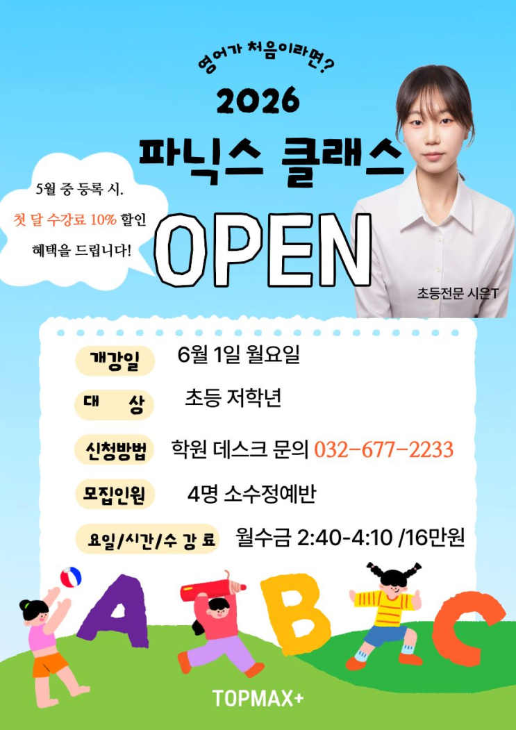 [부천 오정동 영수학원]TOPMAX+영수학원 2026 파닉스 클래스 새롭게 오픈