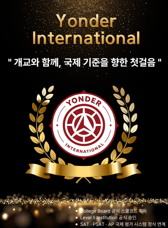 개교와 함께, 국제 기준을 향한 첫걸음 욘더인터내셔널(Yonder International)은 개교와 동시에 College Board로부터 공식 스쿨코드 부여 및 ‘Level II Institution’ 승인을 받았습니다. 칼리지보드는 SAT, PSAT 등 전 세계 대학 입학 표준 시험을 주관하고 AP(Advanced Placement) 교육과정을 운영하는 국제 교육 기관으로, 이번 승인은 욘더인터내셔널이 미국 및 글로벌 대학 진학 시스템과의 공식 연계를 시작했음을 의미합니다. 이번 승인을 통해 욘더인터내셔널은 ✔ 국제 규준 평가 시스템과의 정식 연계 ✔ 학생별 장기 진학 데이터 기반 로드맵 설계 기반 마련 ✔ 보다 안정적이고 신뢰도 있는 글로벌 학업 환경 구축 의 출....... <img src="https://blogthumb.pstatic.net/MjAyNjA0MTVfMjQw/MDAxNzc2MjE1MTA5NTg3.I-nCn-WVZUk1wpPGrU_Y5wYn0v3UVobRJ4KNLs3uPrcg.YMV1uGBQYqecjThhyA9ipJMMKj3YFZnzZvdb7chI1SQg.PNG/123456.png?type=s3" />