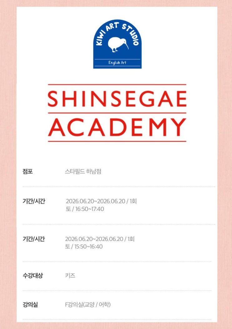 Be inspired and explore your creativity! Kia ora 안녕하세요, 키위아트스튜디오입니다 다가오는 여름 감사하게도 여러 기관에서 강의 요청을 받아 더 많은 아이들을 만날 수 있게 되었어요 먼저, 6월부터 신세계아카데미 스타필드 하남점에서 여름학기를 함께합니다 원데이 클래스 안내 (6월–8월, 월 1회 진행) 1차: 6월 20일 (토) 15:50 ~ 16:40 / 16:50 ~ 17:40 2차: 7월 11일 (토) 15:50 ~ 16:40 / 16:50 ~ 17:40 3차: 8월 1일 (토) 15:50 ~ 16:40 / 16:50 ~ 17:40 대상: 2020년생 ~ 2022년생 정원: 6명 키위아트스튜디오만의 감성을 가득 담아, 아이들이 자유롭게 표현하고 자신만의 감각을 발견해가는 시간을 준비하고 있....... <img src="https://blogthumb.pstatic.net/MjAyNjA0MjRfMTI4/MDAxNzc3MDI1NjU4NTAx.qHeEudX8d0VBJz0Twne64j5c7ZLgL6MutdYUcIiznt0g.rOdRmLRUMwEYFRS05PptE_SDTi9i1L1P71Tv2OR4ppog.JPEG/%C1%A6%B8%F1%C0%BB_%C0%D4%B7%C2%C7%D8%C1%D6%BC%BC%BF%E4._%284%29.jpg?type=s3" />
