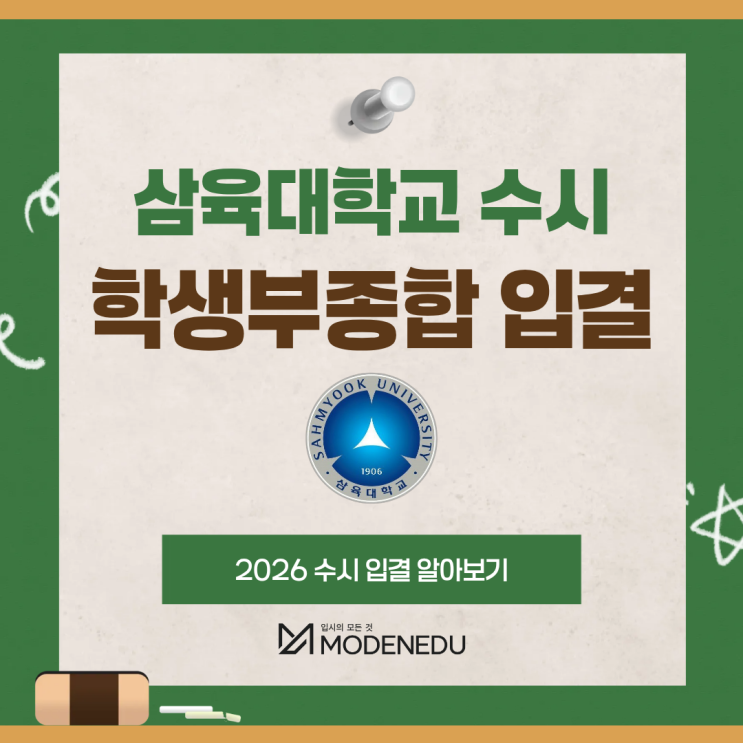 안녕하세요! 결과가 다른 입시의 시작 모든에듀케이션입니다. 2026학년도 입시가 끝나고 2027학년도 입시를 위해 많은 분들이 관심을 갖고 계실거라 예상됩니다. 힌트를 드리자면 그 중에서도 가장 먼저 시작과 마무리가 진행되는 수시 시즌은 벌써부터 많은 분들이 신경을 쓰고 계실 것 같은데요. 수시 전형 중에서도 지속적으로 변화가 발생한 학생부종합전형에 대해 알아보고자 합니다. 이번에 알아볼 정보는 삼육대학교 수시 학생부종합전형 입결입니다! 수시 학생부종합전형의 전형 방법 및 특징 2024학년도 대입부터 자소서가 아예 폐지되며 수시에 반영되는 생활기록부 역시 매우 간소화되었습니다. 봉사활동이나 교내 수상경력 등 많은 요....... <img src="https://blogthumb.pstatic.net/MjAyNjA0MjRfNzQg/MDAxNzc3MDI2MTE2NTUy.GYUN-xXnTt8xB5x9ZQVasG3zY5EdcbAs6vIIExT0Ansg.WFPi-aO_Up_8TJX1fq7pKPLqMs1VOQic4iqD7jpNgfwg.PNG/1.png?type=s3" />