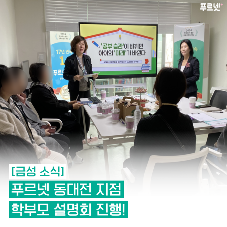 안녕하세요. 금성출판사 푸르넷입니다! 지난 4월 1일 수요일, 푸르넷 동대전 지점 학부모 설명회가 열렸습니다. 아이들 교육에 누구보다 진심이신 초등·중등 학부모님들을 위한 푸르넷 설명회로 공부 습관과 교육과정을 면밀히 살펴보고 이야기를 나누며 뜻깊은 시간을 보냈다고 해요! 유익했던 학부모 설명회 현장을 소개합니다~ 설렘 가득했던 동대전 지점 학부모 설명회 현장! 4월의 첫날, 따뜻한 봄기운과 함께 여러 학부모님들께서 찾아주셨습니다. 새 학기를 한 달 정도 보내면서 올바른 학습 방향과 학습 습관 잡기에 대해 고민이 참 많으셨을 텐데요. 그래서 이번 설명회에서는 [공부 습관이 바뀌면 아이의 미래가 바뀐다] 교육....... <img src="https://blogthumb.pstatic.net/MjAyNjA0MjRfMTI2/MDAxNzc2OTkxNTU1Nzk1.YLvqTJvEamw-vt2sDCWhmW-2JUGFCceZUWWAAzLfrq4g.M5BpJTS2W_1VlTpA4YmIverRkG8cQSB6-x7MtHcFVLIg.PNG/%BA%ED%B7%CE%B1%D7%BD%E6%B3%D7%C0%CF-028.png?type=s3" />
