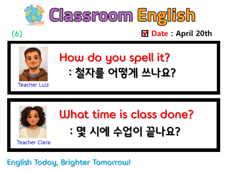 안녕하세요 TEENC 어학원입니다. 이번주 Classroom English 소개해드립니다. * 철자(스펠링)를 어떻게 쓰나요? How do you spell it? * 몇 시에 수업이 끝나요? What time is class done? <img src="https://blogthumb.pstatic.net/MjAyNjA0MjBfMTUw/MDAxNzc2NjYxMTI4MzM0.ll0wLsQH2h521jp77G9wGopnIUauT4OAa0Z7nnkpaWog.9XIQJ4umpfTyJRRPwwwwnOdJ1HLFiMaWwYxGu_lnbTAg.PNG/Classroom_English_2026_%286%29.png?type=s3" />