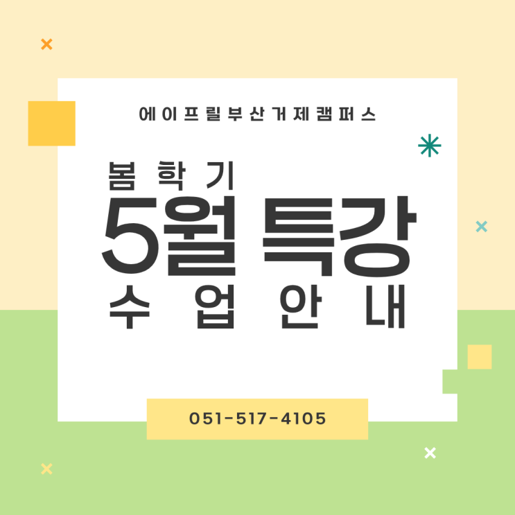 안녕하세요, 에이프릴부산거제캠퍼스입니다. 봄학기 5월 특강 수업을 안내드립니다! (/≧▽≦)/ 신청은 4/20(월)부터 전화로 받습니다. 궁금한 사항은 원으로 문의주세요. 감사합니다. <(^-^)> 051-517-4105 <img src="https://blogthumb.pstatic.net/MjAyNjA0MTRfMjcw/MDAxNzc2MTQyOTA5NTY2.9eBEfRtjIZ0D7hzgiVr9MfEAd96_q3XcSuAYX6QFGOUg.V3ZCoKwR-Z4omPwRd_Zg6fdhKpQnD6o36fvFKBXQBU0g.PNG/5%BF%F9_%C6%AF%B0%AD%BE%C8%B3%BB_%BA%ED%B7%CE%B1%D7%BF%EB.png?type=s3" />